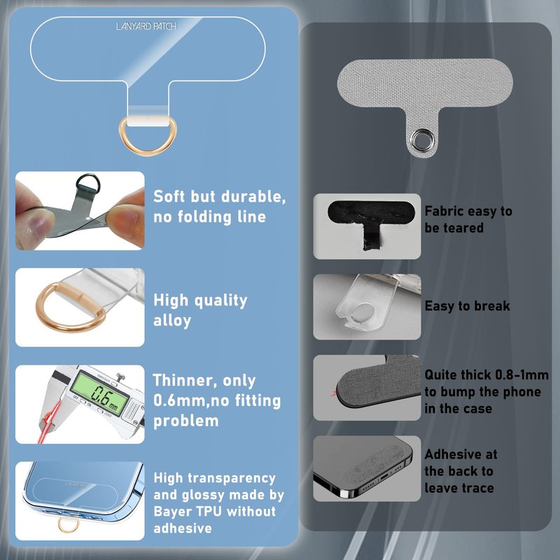 - TPU material: this cell phone lanyard pad is made of high quality soft TPU material. It is super clear, sturdy, thinner, wear resistant and durable, not easy to break like other nylon patch or PVC pacth. This phone lanyard patch can be used for long time. And this cell phone lanyard patch tab is designed without adhesive, so you don't have to worry about the glue after removal.