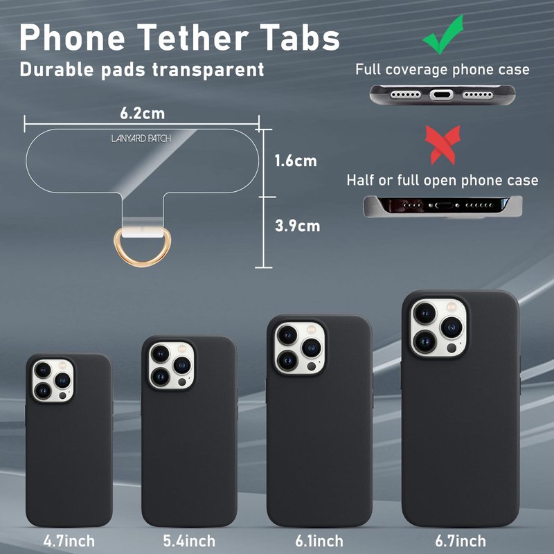 - Universal: the clear cell phone lanyard tether tab measures approx.2.4 x 0.6 inches; With the appropriate size, the phone patches tab is suitable for fitting most size of phone charging hole as long as you have a full coverage phone case. The end are equipped with rust-proof metal hooks, which can not only improve security, but also can be applied to fix with your keys, wallet, phone wrist straps, phone lanyards, phone crossbody straps.