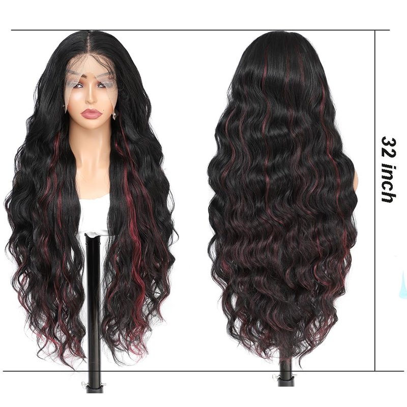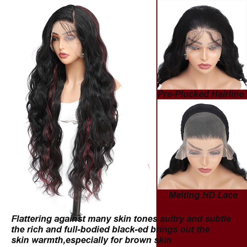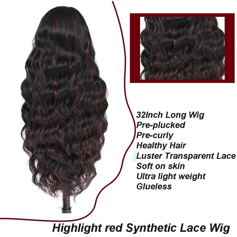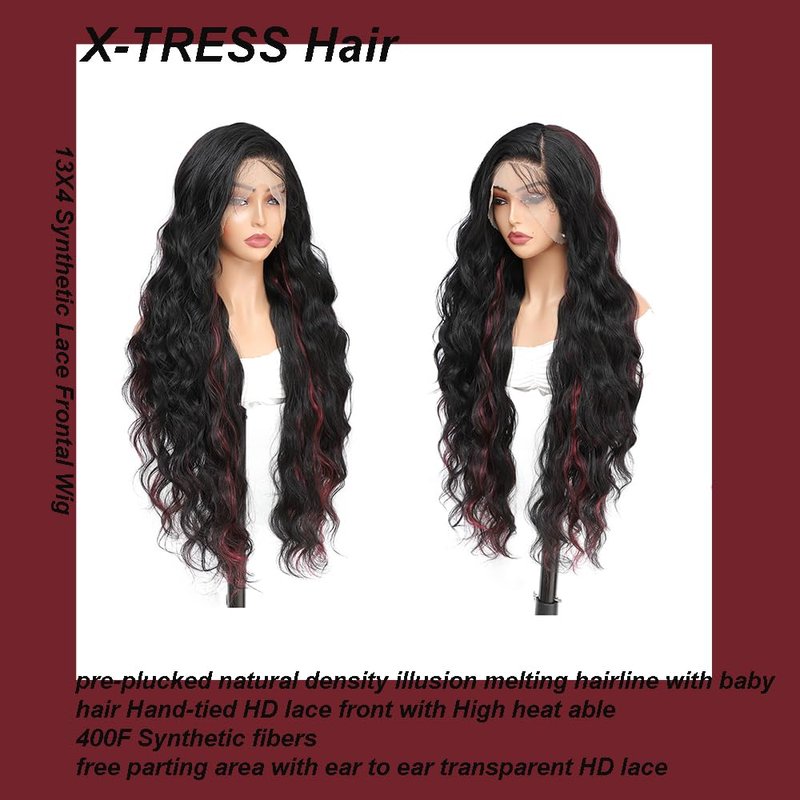 X-TRESS Red Higlight HD Lace Front Wig 32Inch Body Wave Glueless Synthetic Lace Front Wigs for women Preplucked Ready to Wear with Baby Hair Free Part for Daily Party Use(#F1B/BURG)