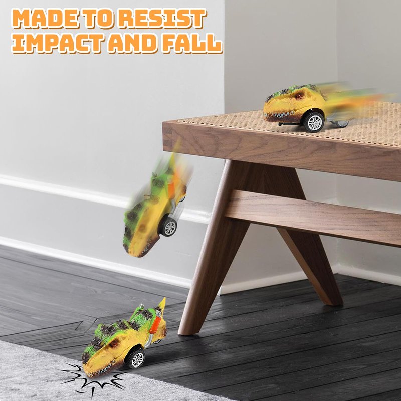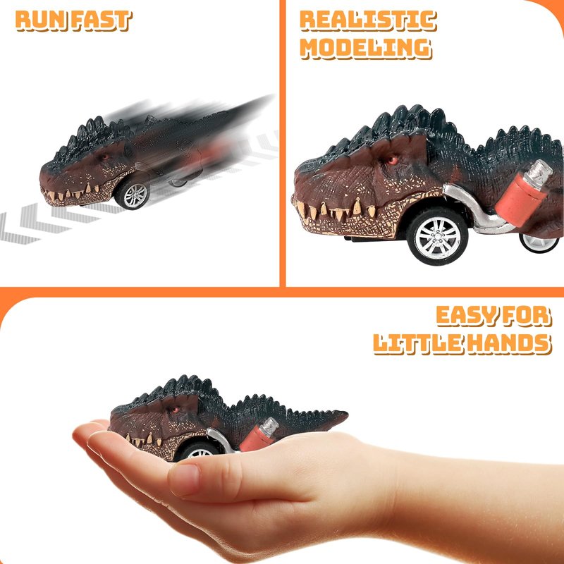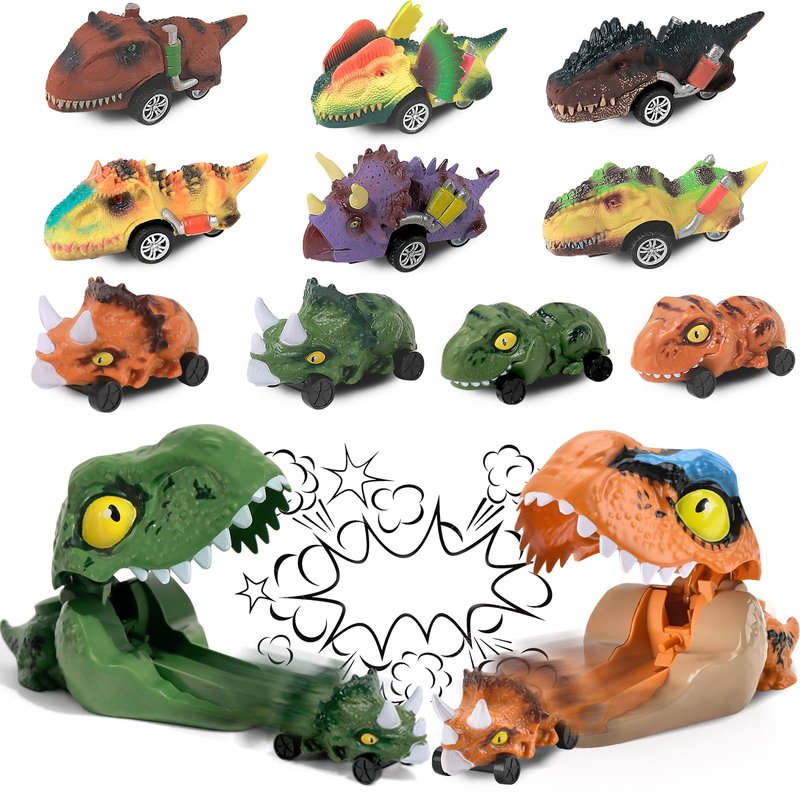- 12 In 1 Dinosaur Toys: this kids dinosaur toys set includes 2 big Tyrannosaurus Rex launchers, 4 small dinosaur ejection cars and 6 pull back cars(don't fit in the laucncher). Just press the button, push the small dinosaurs along the track into the big dino mouth, and press the button and launch.