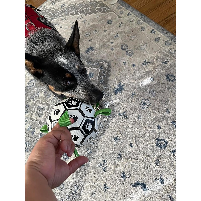 - Upgrade your dog's interactive toy: A dog football with nylon studs sewn evenly into the seams not only creates an irregular bounce that dogs love to chase, but also makes it easier for dogs to fetch, throw, yank and fetch. The dog's paws are evenly printed on the dog toy ball to attract dogs' attention. There is a longer strap for people to hold the ball, making it a great interactive dog toy for dog training.