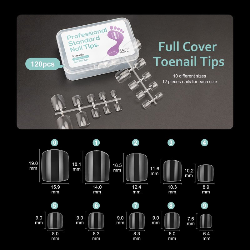 - 10 sizes for options: The X&D fake toe nail kit includes 10 sizes of soft gel clear fake toe nails to meet your various needs.