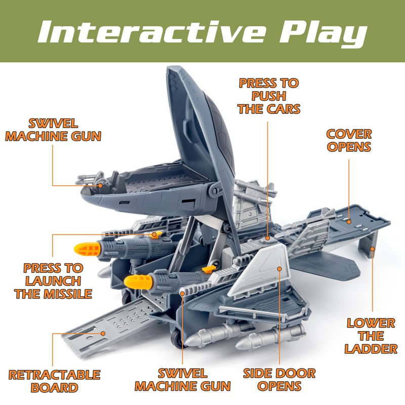 - Realistic Details: The heads and tails of military jet aircraft can be opened. The missiles can be fired by pressing. The gun can be rotated and the board can be retractable. These realistic details bring more happy time for children. There are more details to explore.