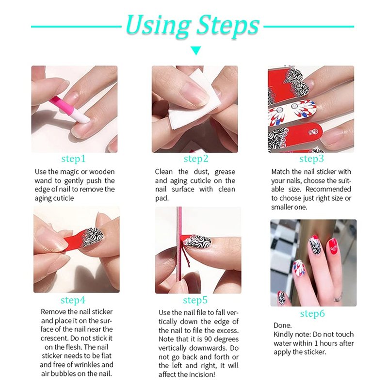1)Do not apply on cuticle and skins. Leave a bit space between nails with cuticle, so the stickers can keep for longer