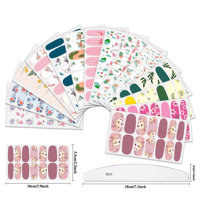 - PACKAGE CONTENTS - Comes with 14 sheets spring flower full nail stickers in different colors and patterns, each sheet contains 14 pieces, totally 196 pieces, sufficient to meet your DIY nail art decoration needs, comes with 1 piece moon shape nail file, can bring much convenience to the DIY process.