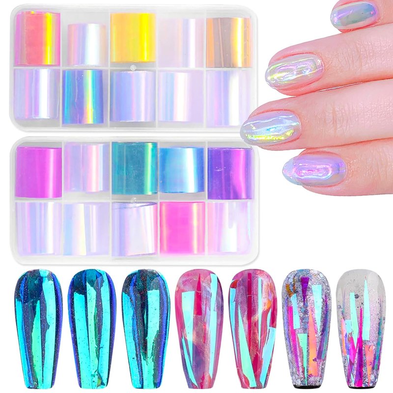- 🌈【Package Content】 - 20 rolls nail glass foil have glittery and gradient aurora designs, with a storage box. 0.98inchs*19.7inchs (2.5*50cm). BE ATTENTION: It Is Not Transfer Foil !