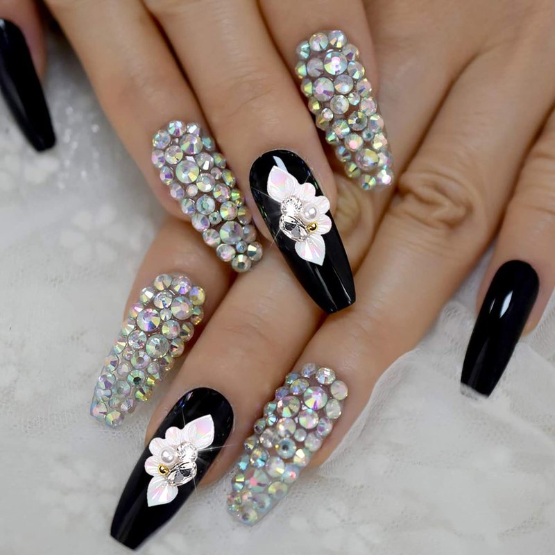 - đșăExquisite Designă: These white nail charms are featuring with flower shape, the design of the petals is lifelike, and the center of the petals is inlaid with clear rhinestone pearls and golden beads. They look exquisite and beautiful, and sparkle in the light, can help you create eye-catching nail decoration effect.
