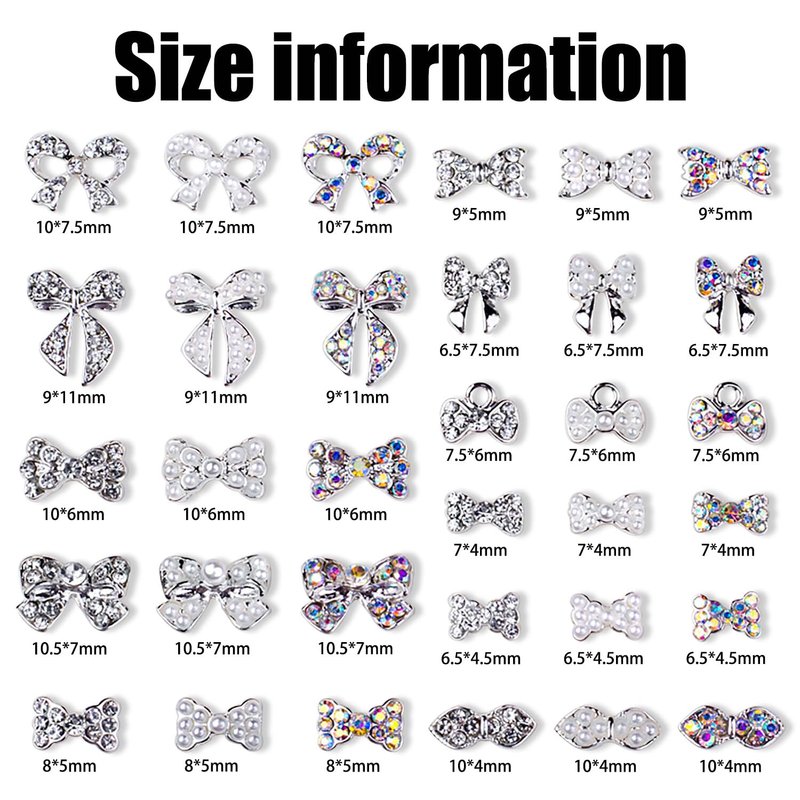 • 🎀【3D Bow Nail Charms】: 33 pieces silver bow nail charms. It contains 11 styles, and each style has 3 types (iridescent diamond, clear diamond and pearl). Multiple choice, gives you different nail design every time.