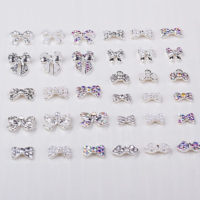 XEAOHESY 33 Pieces Silver Alloy Nail Bow Charms for Nails Bow Nail Charms Gems Bowknot Nail Studs Inlaid Pearl Clear Iridescent Rhinestone for Women Girls Nail Art Decorations