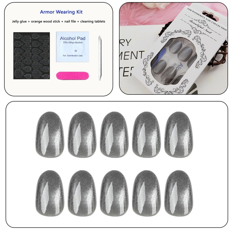 - With 24 cat eyes press on nails presses per box, a sheet of jelly glue, 1 cuticle stick, 1 double-sided nail file and cleaning pad, this set contains all the tools you need to sharpen your nails.