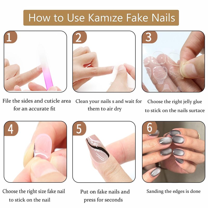 - You can use the nail stickers we give you (use the nail stickers, and the false nails can be reused). However, nail glue strips are not as effective as liquid nail glue. If you want the glue on your nails to last longer, you can use liquid nail glue, which lasts for 1-2 weeks.