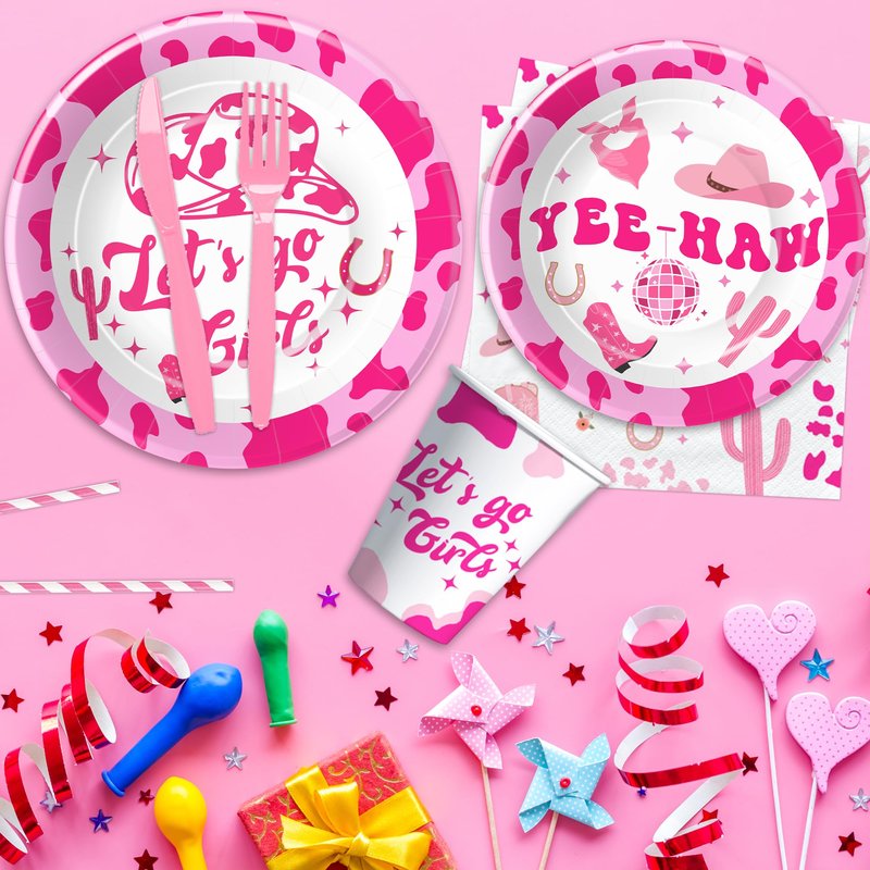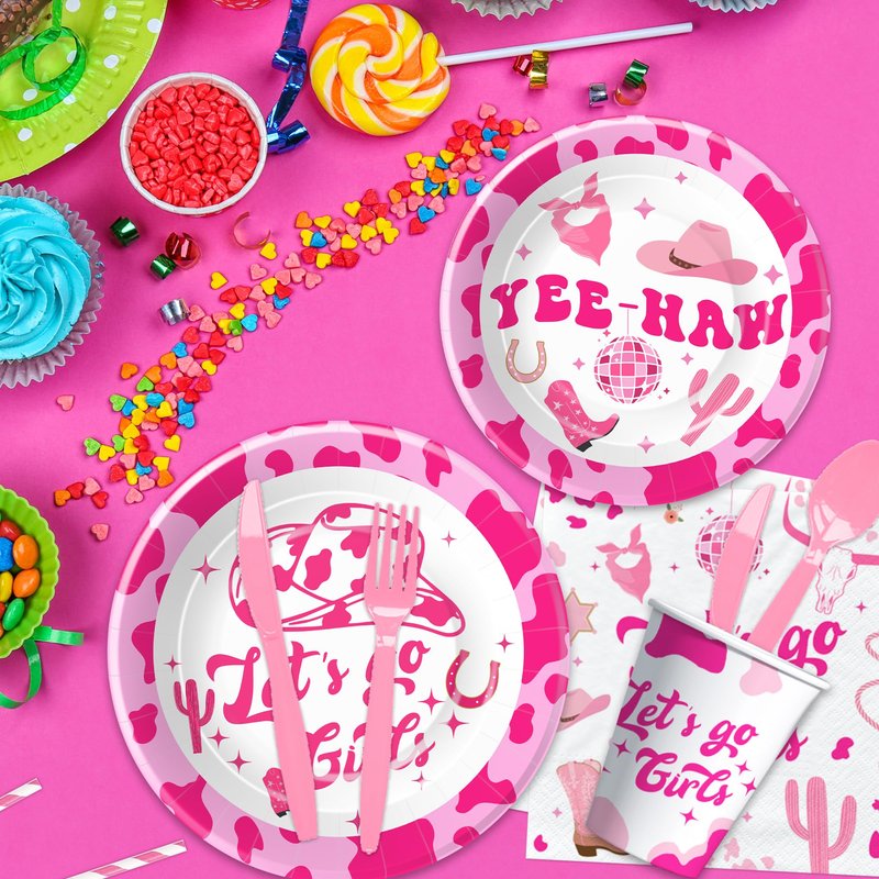 - 【Serve 24 Guests】This hot pink disco cowgirl birthday party supplies tableware set can accommodate up to 24 guests and includes everything you need: 24pcs 9'' cowgirl paper plates, 24pcs 7'' let go girls party plates, 24pcs napkins, 24pcs cups, 24pcs disposable forks. Get these cowgirl theme table decorations to elevate your celebration