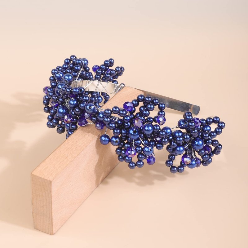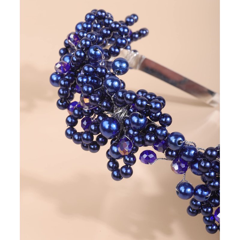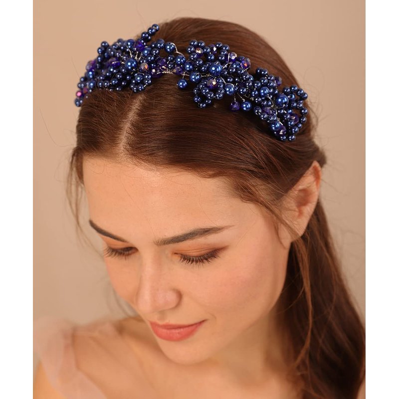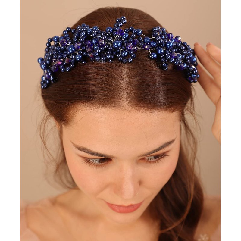 Xerling Floral Pearl Headband Tiara for Girls Bridal Hair Accessory for Wedding Blue Crystal Crown for Party Headdress Hair Band Jewelry (Blue)