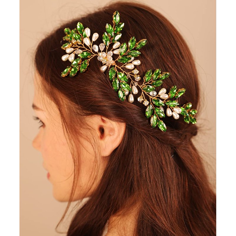 Xerling Green Rhinestones Emerald Hair Comb Vintage for Wedding Brides Pearl Hair Piece Accessory Bridal Head Piece (Emerald A)