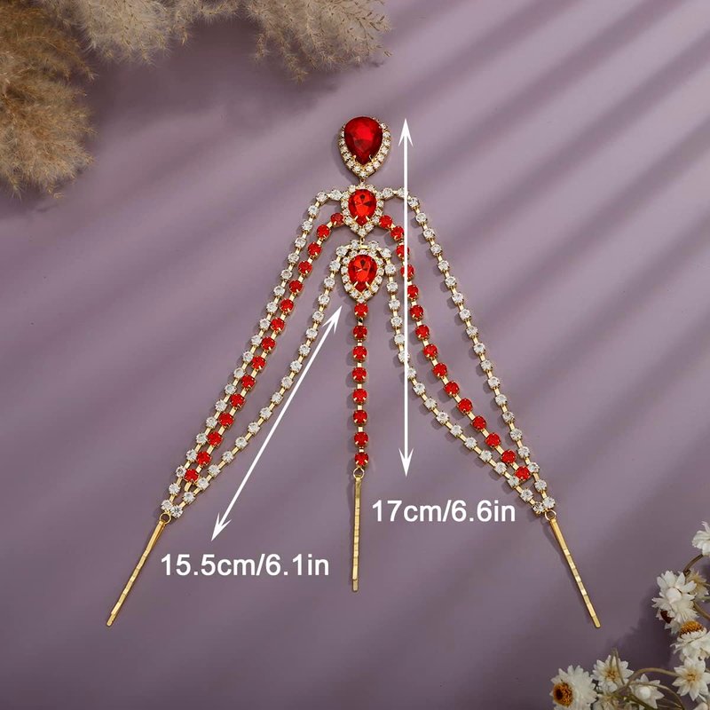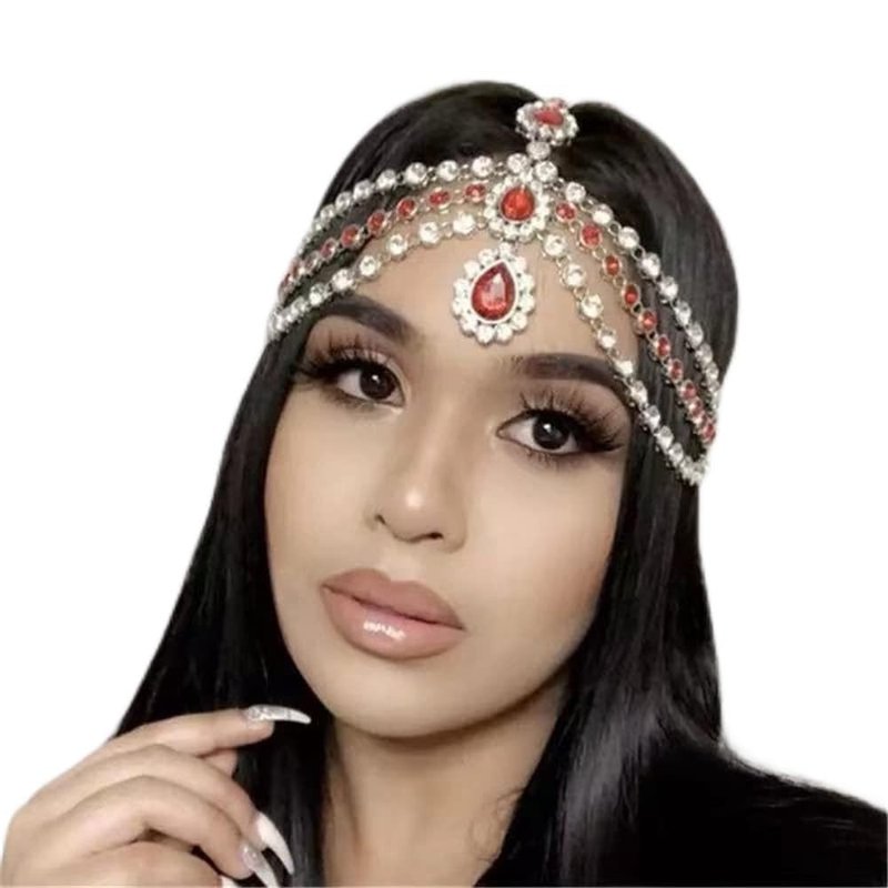 Xerling Red Crystal Pendant Head Chain Boho Layered Rhinestones Forehead Headpiece Tassel Head Jewelry for Women Wedding Hair Clip Accessories for Brides (Red-Gold)