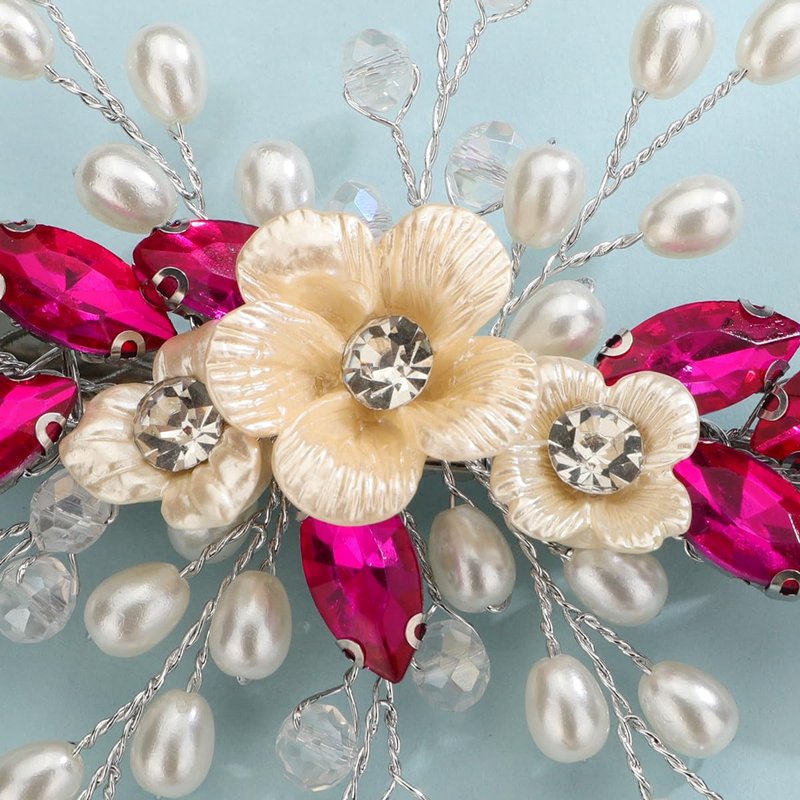Xerling Rose Red Rhinestones Crystal Flower Hair Barrettes Clip Boho Bridal Pearl Hair Jewelry Accessories for Women Wedding Floral Headpieces (Rose Red)