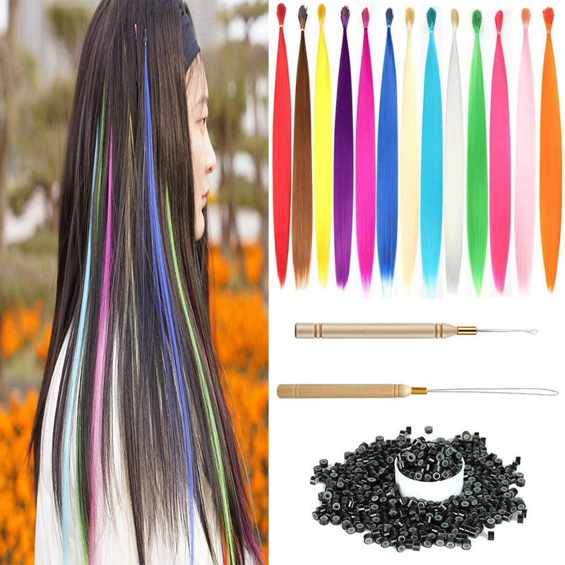 XIAO TAO ZI 39pcs/Lot 20'' Synthetic Rainbow Hair Extensions kit Colored Hair Pieces +50 Pcs Silicone Micro Beads+2 Pcs Crochet Hooks (20 Inches, 39 Pieces)