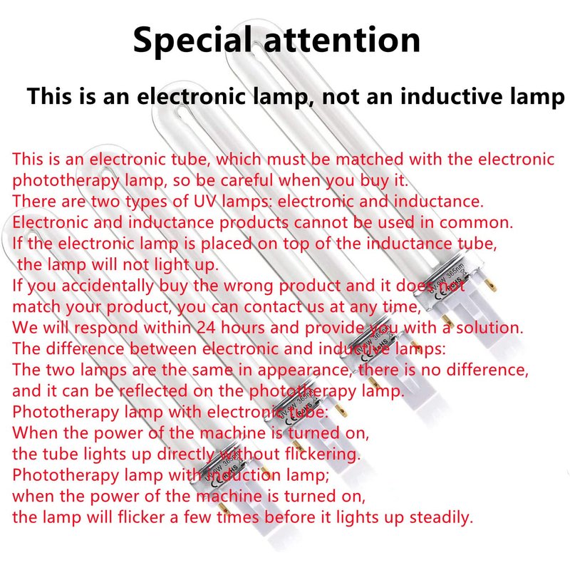 - Note: This is an electronic tube, which must be matched with the electronic phototherapy lamp, so be careful when you buy it. There are two types of UV lamps: electronic and inductance. Electronic and inductance products cannot be used in common. If the electronic lamp is placed on top of the inductance tube, the lamp will not light up.