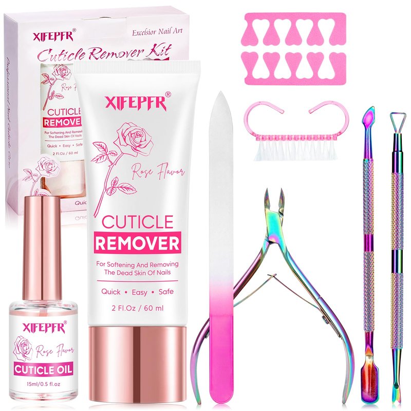 - 8 in 1 Cuticle Remover Kit: XIFEPFR cuticle care kit provides you 2 OZ cuticle remover cream, nail cuticle oil, cuticle trimmer, cuticle pusher, cuticle peeler, nail file, nail brush. Whether softening cuticle or removing cuticle, repairing nails, this kit can satisfy your nail care needs. Suitable for professional nail salon or home use.