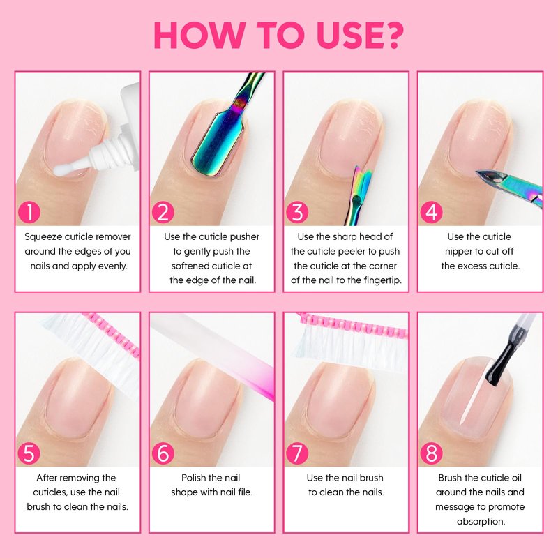 - Quickly Softens and Moisturizes Cuticles: Our cuticle kit includes a bottle of cuticle remover cream. The white gel cream texture easily penetrates dry cuticles and simply applies evenly to the cuticles on the nail edges, quickly softening cuticles and dead skin in 15-30s, gently moisturizing. Use with cuticle removal tool for clean cuticle removal.