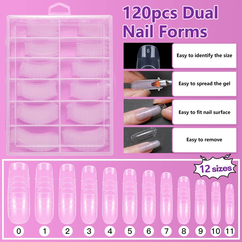 - 120pcs Poly Dual Nail Forms: 120pcs dual nail forms in 12 different sizes, 10pcs of each size. The 12 sizes correspond to numbers 0-11, you can choose the size that suits your nails. Dual nail forms made of high quality ABS material, reusable. 8pcs nail clips hold the double nail forms on the nail to make the poly gel stronger on the nail.