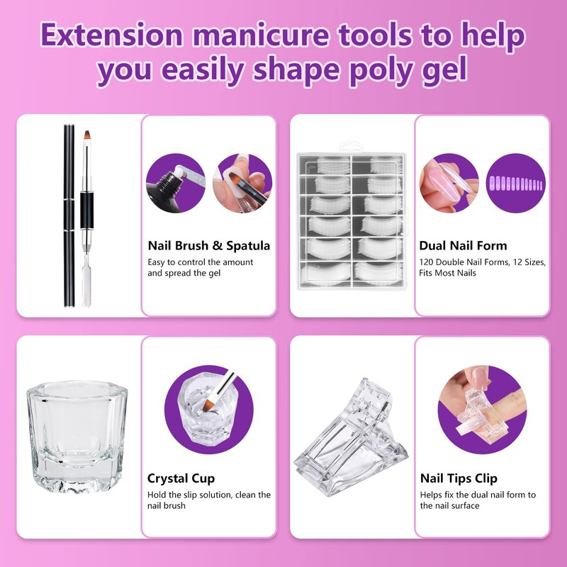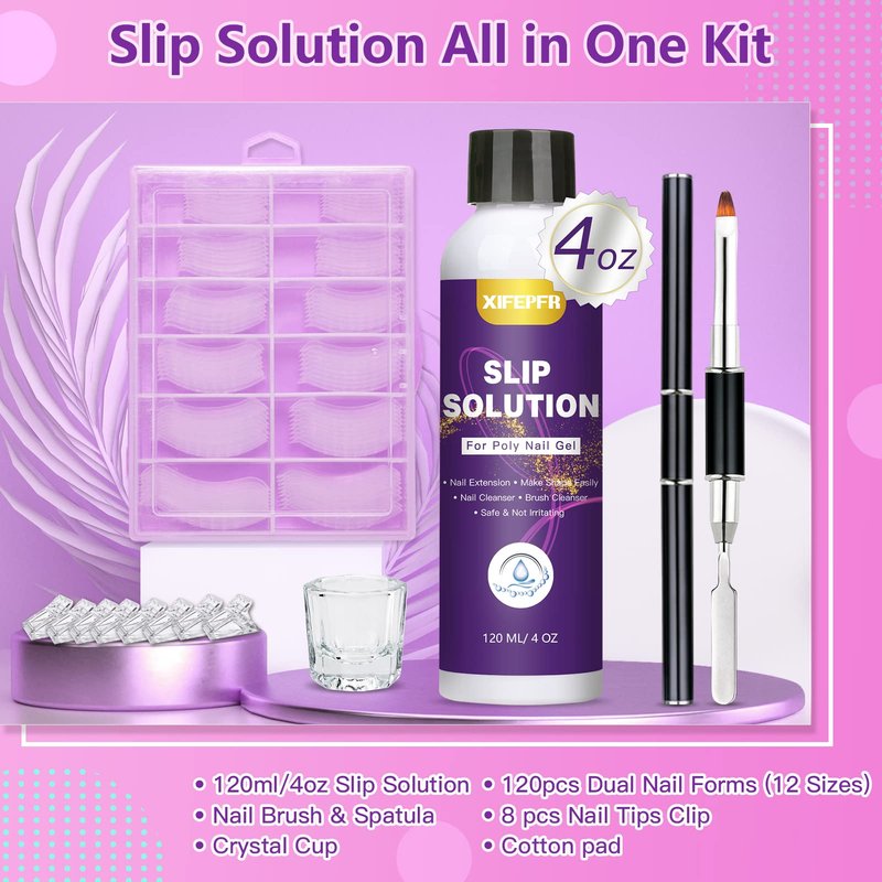 - Slip Solution All In One Kit: XIFEPFR slip solution kit for poly nail gel contains 4oz polygel slip solution, 120pcs dual forms in 12 sizes, 8pcs nail clips, a dual-ended nail brush, a crystal cup, nail cotton pads. Practical all-in-one kit for all your needs for poly gel extension nail art. This slip solution kit is suitable for nail salon and home DIY.