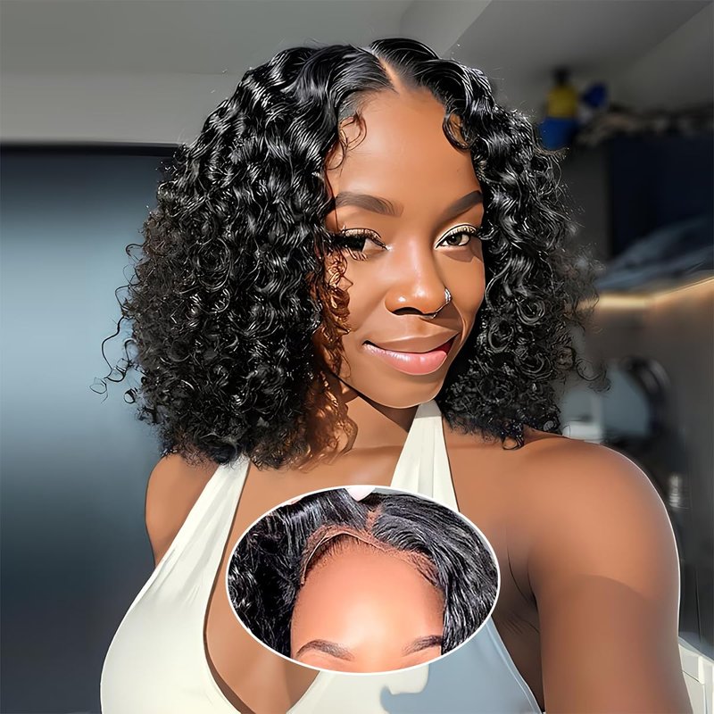 Wear and Go Glueless Wigs Human Hair Pre Plucked Pre Cut 6x4 Short Curly Bob Lace Front Wigs for Black Women Natural Hairline Water Wave Lace Front Wigs 200% Density 12 Inch