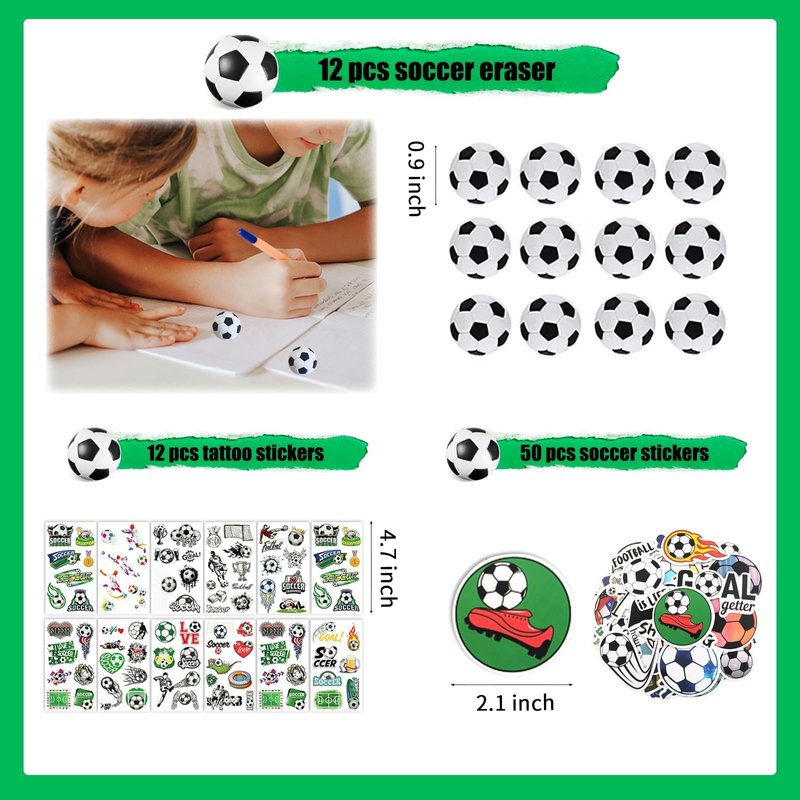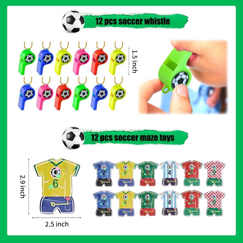 - PACKAGE - Soccer party favors Include 12 soccer paper bags, 12 soccer slap bracelets, 12 soccer erasers, 12 soccer whistles, 12 soccer keychains, 12 wristbands, 12 tattoo stickers, 12 soccer puzzle toys, 50 soccer stickers, total 146 pieces soccer party favors, they can meet your different needs.