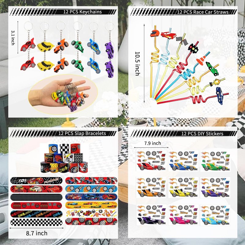 - PACKAGE - Race car birthday party favors Include 12 mini race car toys, 12 paper bags, 12 slap bracelets, 12 race car keychains, 12 DIY race car stickers, 12 car straws, total 72 pieces race car party favors toys, will be great for birthday party.