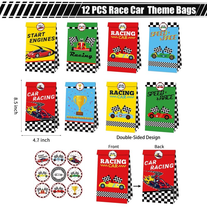 - RACE CAR THEME - Race car party favors are designed with classic elements, such as trophy, racing track flags, race car, etc. These race car goodie bag fillers are cute and bright in colors, which makes birthday party supplies vibrant. We hope people can share the joy with their friends and families.