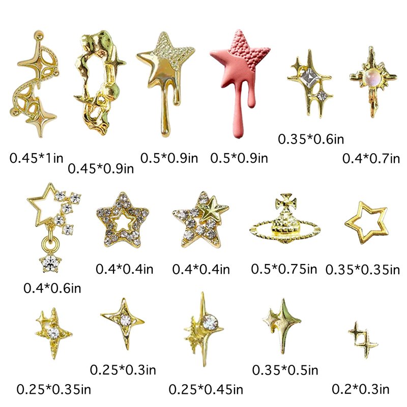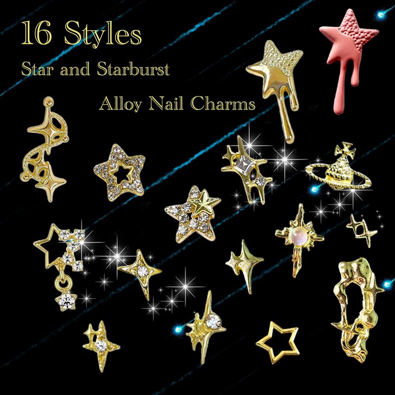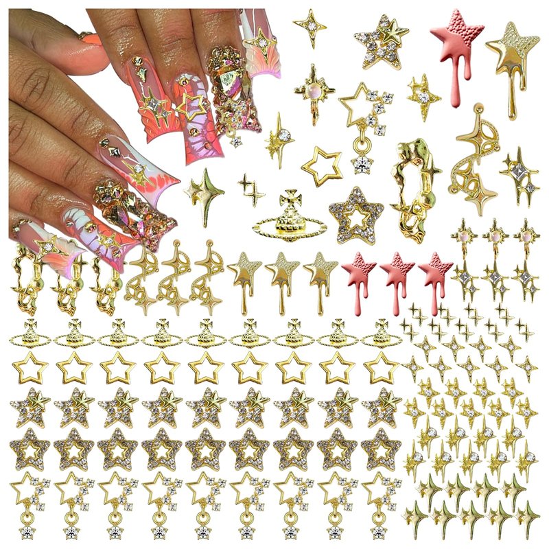 - Package Contains:You will get 124pcs gold star nail art charms.The nail charms include star, starburst, planet, etc.This kit is suitable for creativity nail art.