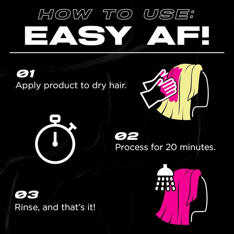 - HOW TO USE: Apply to clean, dry hair with gloves, comb through to evenly saturate hair. Process for 20 minutes. Rinse thoroughly. That’s it!