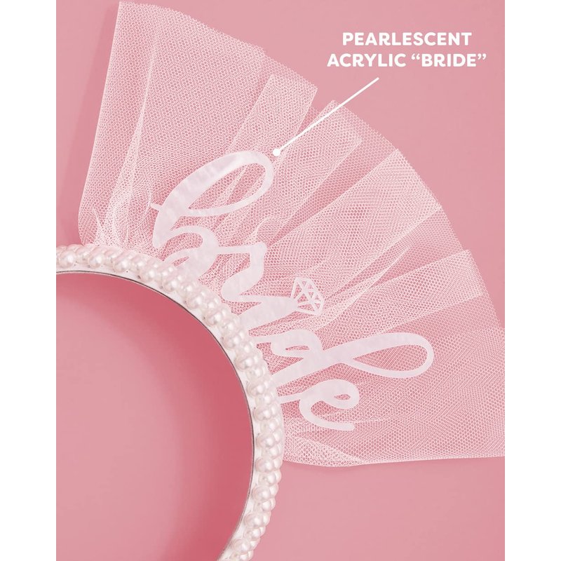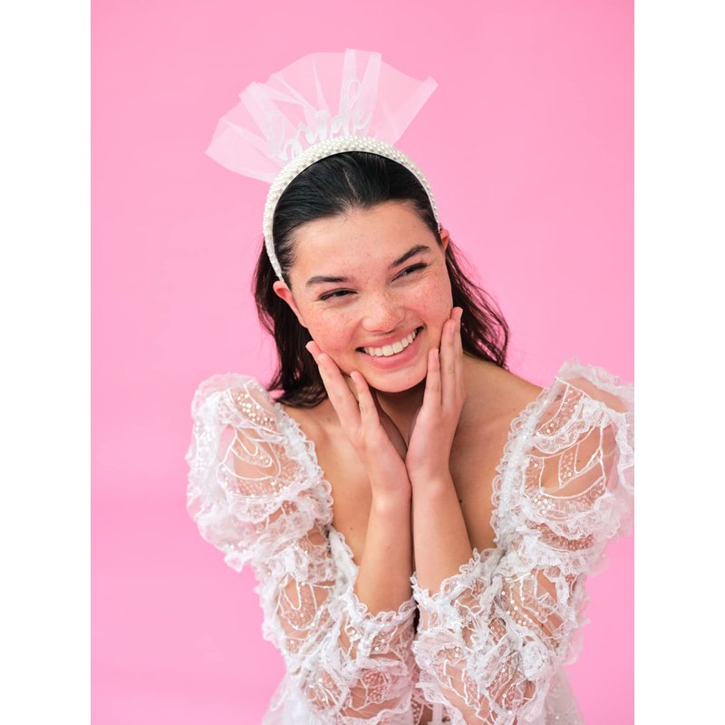 Our pearl bride headband is the perfect addittion to your bachelorette party, bridal shower, or engagement party! Featuring white acrlyic "Bride" lettering and white tulle, this headband is sure to catch everyones attention. Inspired by the classic bride, we created this exclusive pearly white design that makes for the cutest bachelorette party acessory or bridal shower gift. Want more? We make a whole bunch more bachelorette party supplies just as cute as these in our storefront!