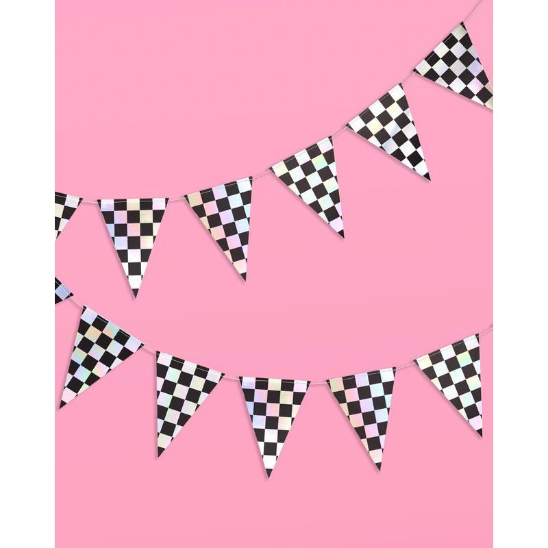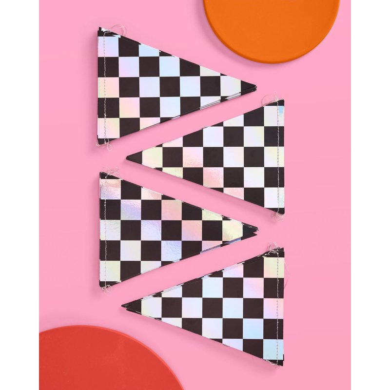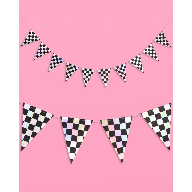 - Squad Approved: Each bunt banner features shiny iridescent paper with black checkered print - think super fun + shiny! The finish feels very luxe + the perfect compliment to your event.