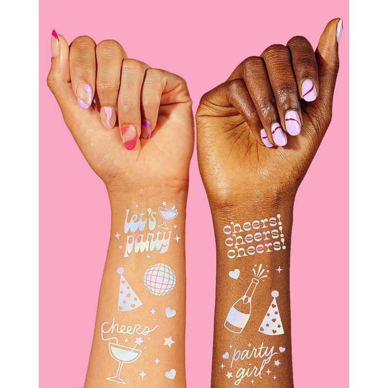 Ready to party?! Strut your way into a super cool party with this colorful set of iridescent temporary tattoos! 2 sheets totaling 52 tats means there's one for everyone - no party girl gets left behind :) Elevate your party with these iridescent tattoos that feature all sorts of fun party designs: champagne, birthday hats, martinis, starts, hearts + more! Party tested + approved... our tattoos will last day into night - so drink up and get tatted, this party one you'll want to remember!