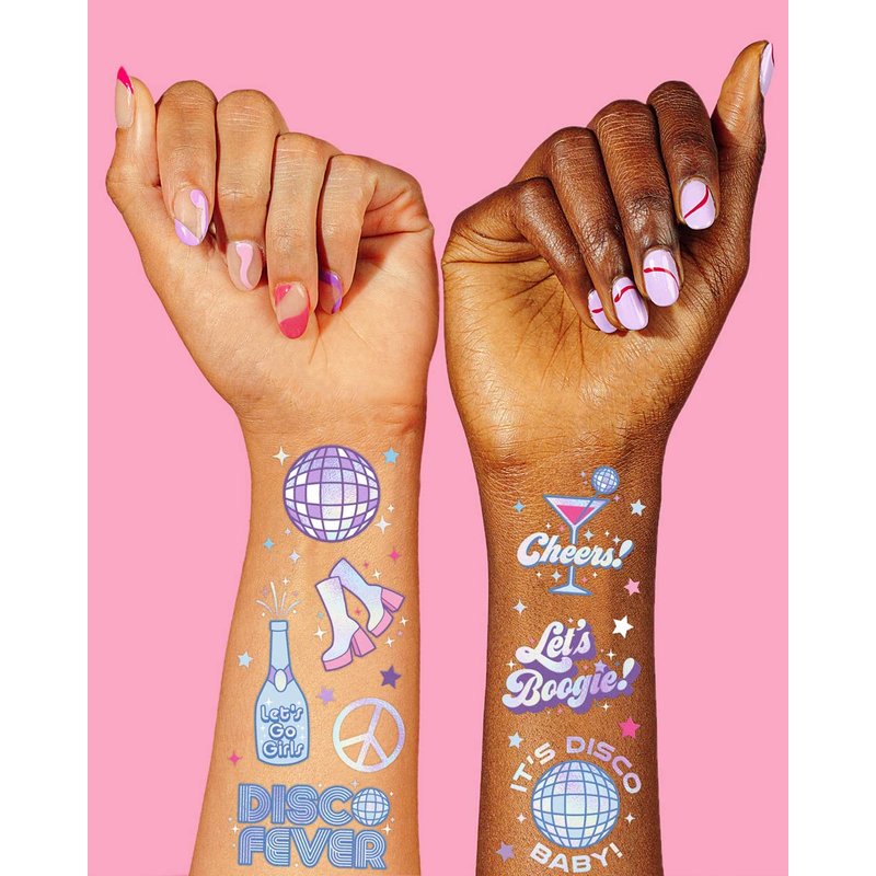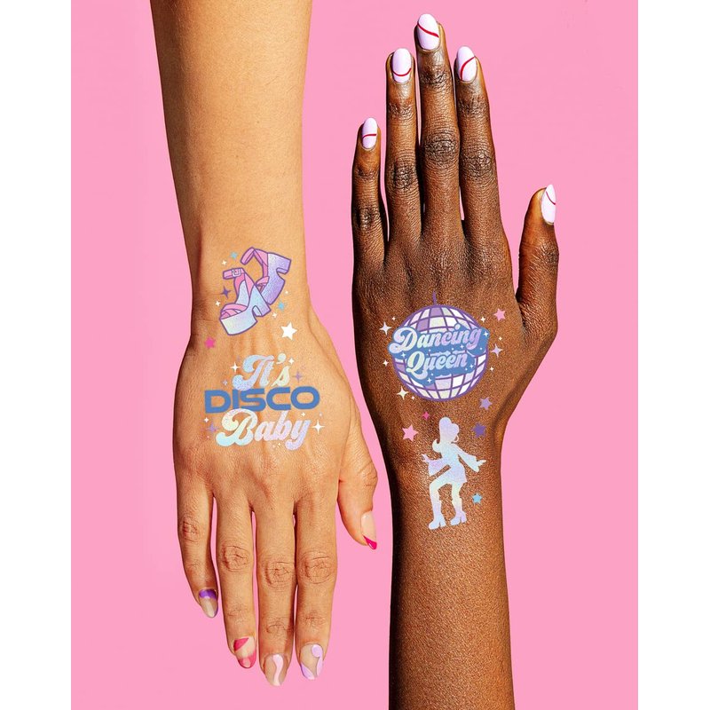 - Tat up: with foil designs like disco balls, peace signs, stars, champagne, boots, dancing queens + more. Guaranteed to be a favorite by all party guests!