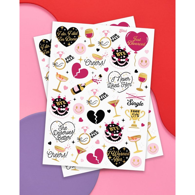 You deserve better!! Strut your way into a super cool divorce party with this colorful set of temporary tattoos! 2 sheets totaling 60 tats means there's one for everyone - no single girl gets left behind :) Elevate your party with these tattoos that feature all sorts of fun designs: broken hearts, martini glasses, rings, balloons, smiles, cake + more! Party tested + approved... our tattoos will last day into night - so list your ring for sale and get ready for your newly single life!