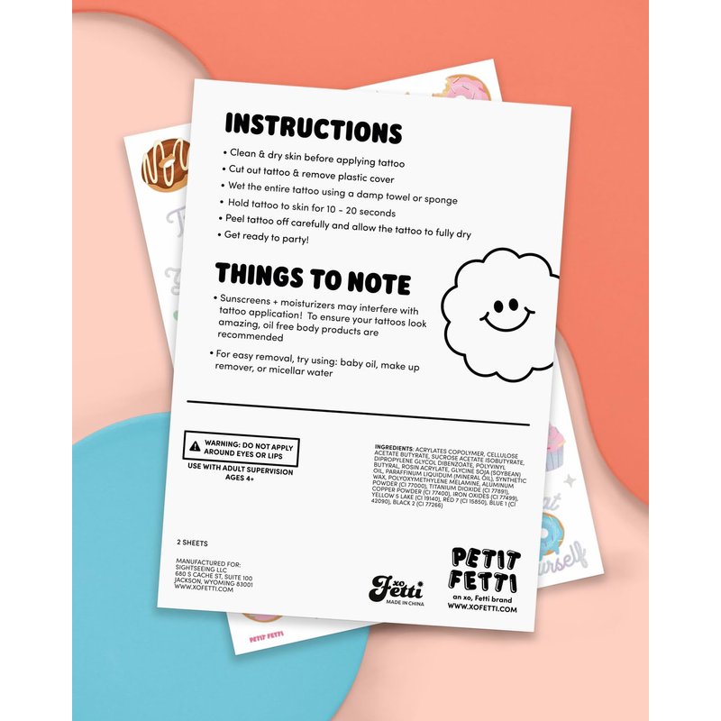 xo, Fetti Donut Party Temporary Tattoos - 50 Iridescent Styles | Dessert Birthday Party Goodie, Ice Cream Kids Favor, Cupcake and Candy Tats