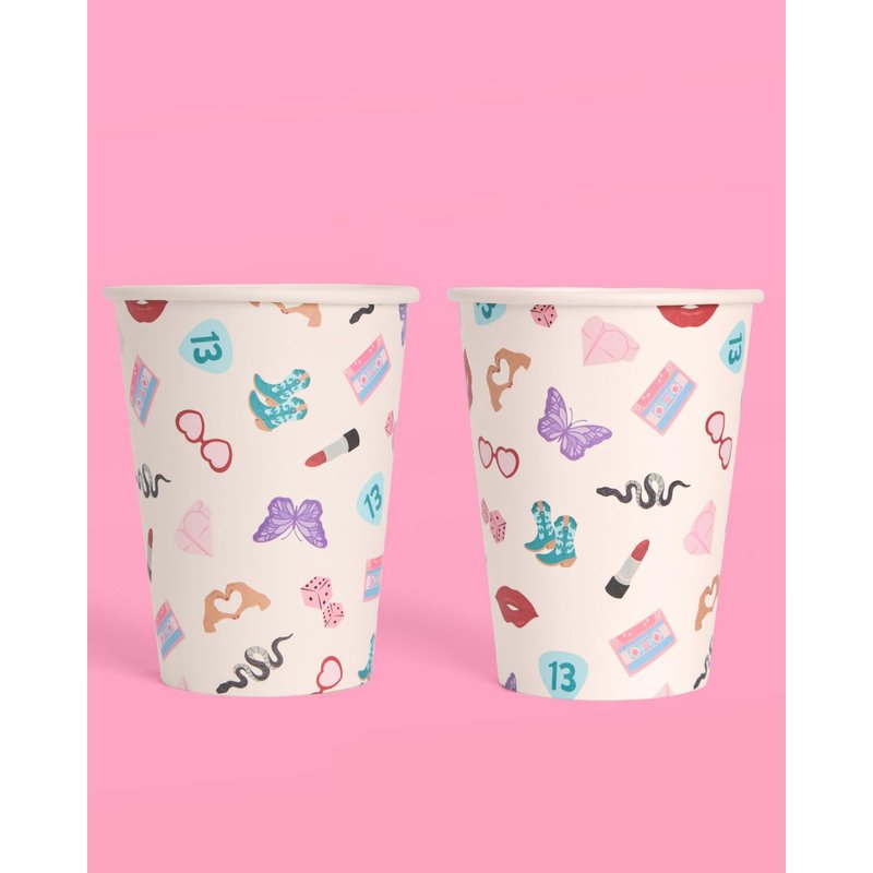- Party Ready: have fun celebrating with this cup set! The set come with 24 fun white cups with all over full color icons - including butterflies, heart glasses, boots, lipstick, 13, snakes and more!