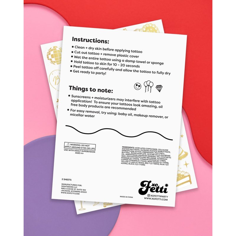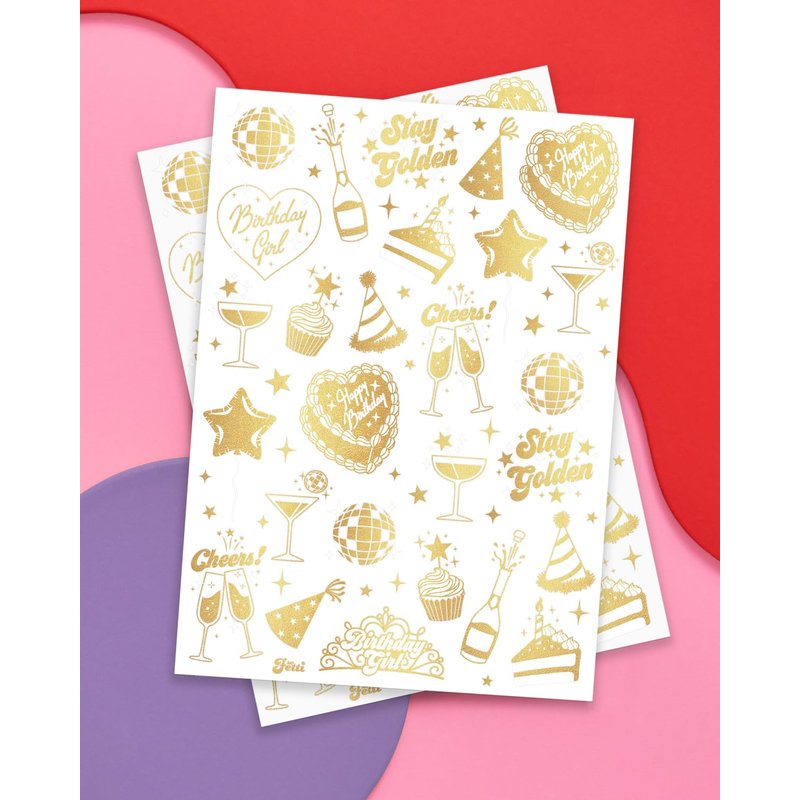 Are you party ready?! Strut your way into a super cool birthday party with this gold foil set of temporary tattoos! 2 sheets totaling 50 tats means there's one for everyone - no hot girl gets left behind. Elevate your party with these gold foil tattoos that feature all sorts of fun birthday party designs: champagne, cake, martinis, disco balls + more! Party tested + approved... our tattoos will last day into night - so drink up and get tatted, this party one you'll want to remember!