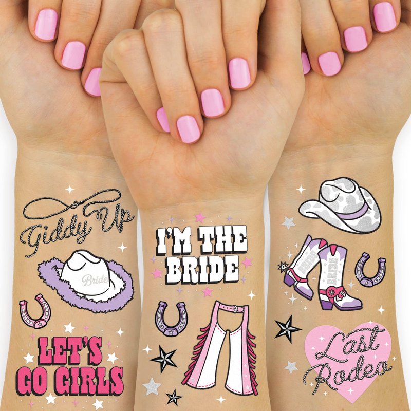 - Let's Go Girls: two sheets with a total of 48 metallic tattoos featuring handdrawn designs of giddy up, cowgirl hat, boots, horseshoe + more that guests will absolutely love!