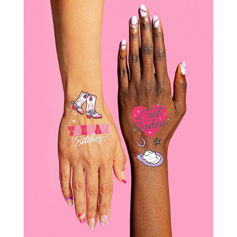 Howdy Y'all?! Strut your way into a super cool bach party with this colorful set of temporary tattoos! 2 sheets totaling 48 tats means there's one for everyone - no cowgirl gets left behind :) Elevate your party with these tattoos that feature all sorts of fun bach designs: last rodeo, giddy up, horseshoe, boots + more! Party tested + approved... our tattoos will last day into night - so saddle up and get ready for the ride of your life!