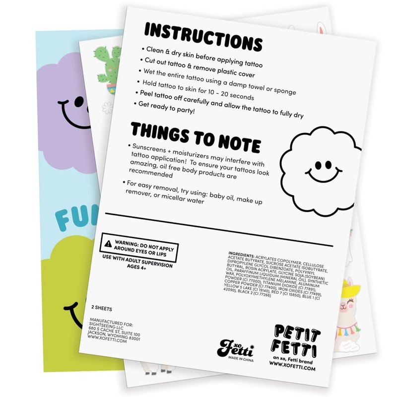 Llama mia! These llama tats are just TOO cute! Make your way into a super fun party with this colorful set of temporary tattoos! 2 sheets totaling 46 tats means there's enough llama love for everyone - no partier gets left behind! :) Elevate your party with these tattoos that feature all sorts of adorable party essentials: colorful llamas, cacti, plants, flowers + more! Party tested + approved... our tattoos will last day into night, so you can save the drama for your llama!