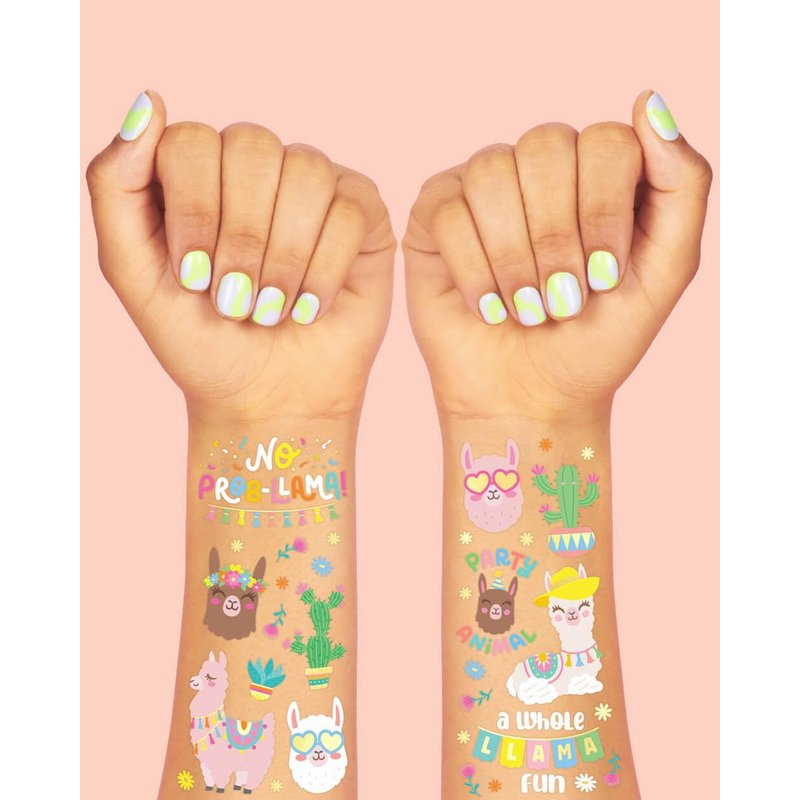 - Tats for The Whole Party: two sheets with a total of 46 colored + metallic tattoos featuring handdrawn designs of llamas, flowers, cacti + more that kids will absolutely love!