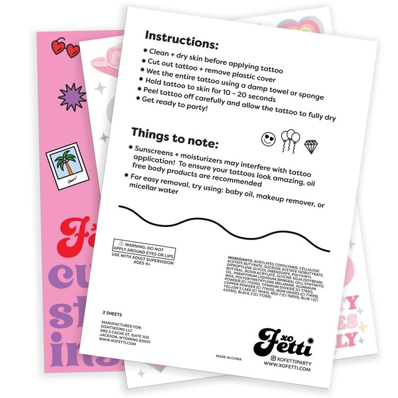 - To Apply: place your favorite design face down on clean + dry skin. Next, use a damp paper towel and lightly pat the tattoo paper. Remove the tattoo paper and enjoy! Don't worry- we included instructions on the back of each sheet!