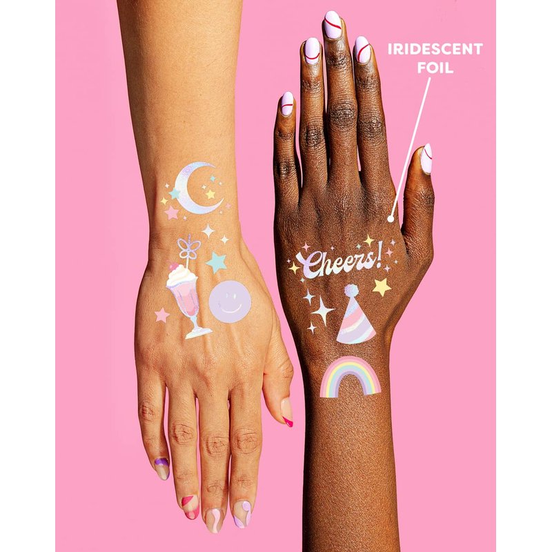 - Tat up: with foil designs like smiley faces, hearts, rainbows, cowgirl hats, cake, sparkles + more. Guaranteed to be a favorite by all party guests!