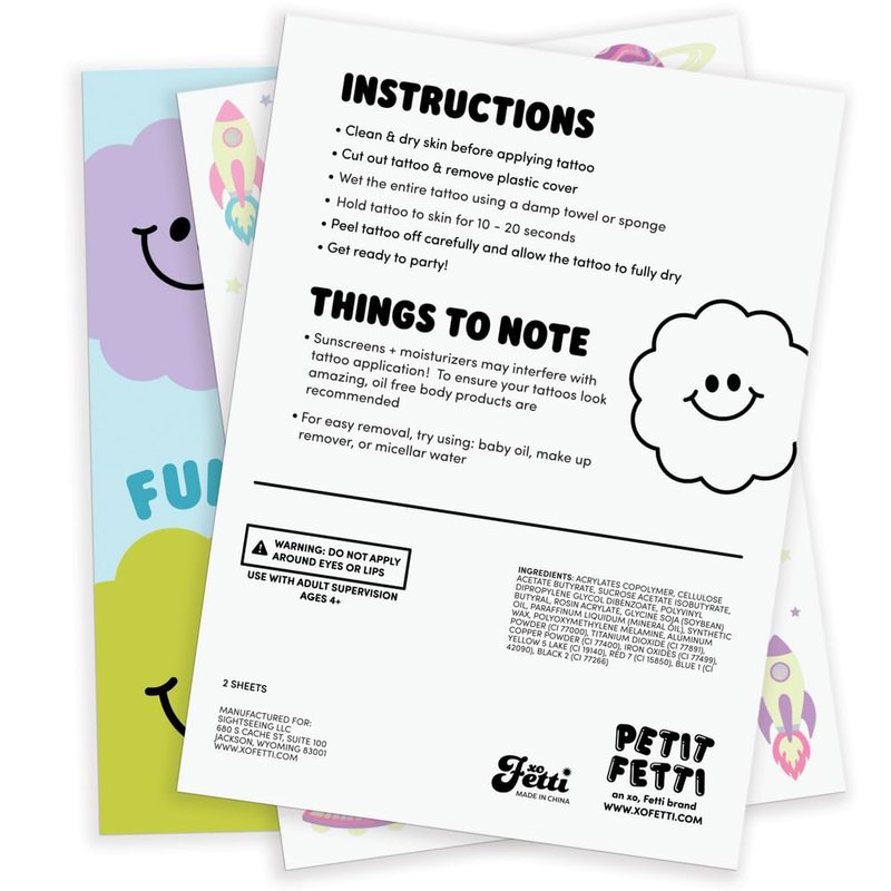 - Greetings Earthlings: our fun temporary tattoos have been put through rigorous party testing and are 100% guaranteed to last day into night - the perfect birthday party decorations!
