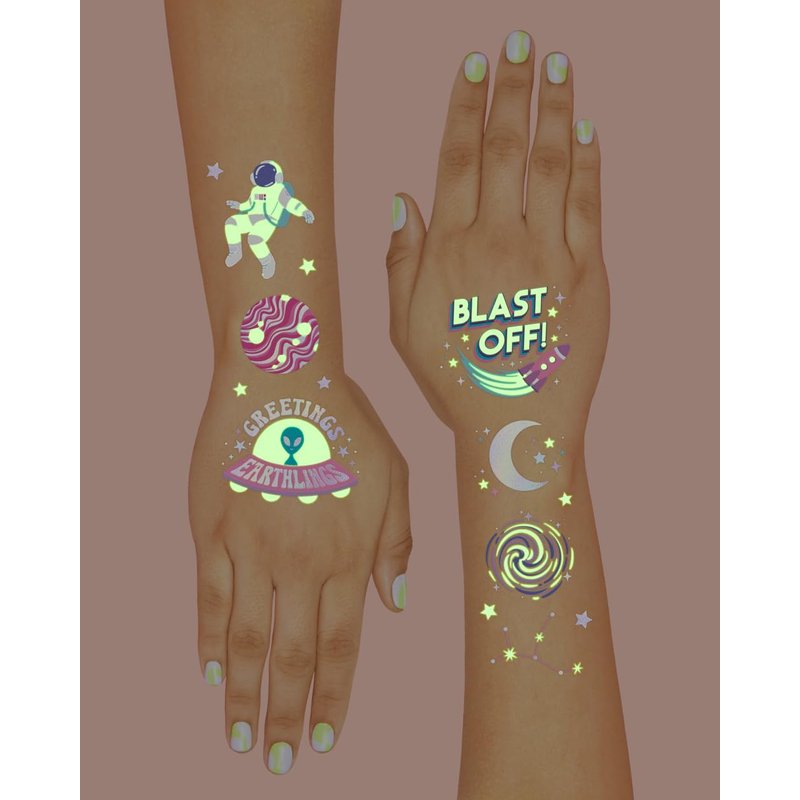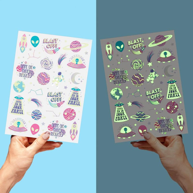 - Blast Off: two sheets with a total of 50 glow in the dark tattoos featuring handdrawn designs of mars, aliens, rocket ships, shooting stars, planets + more that guests will absolutely love!