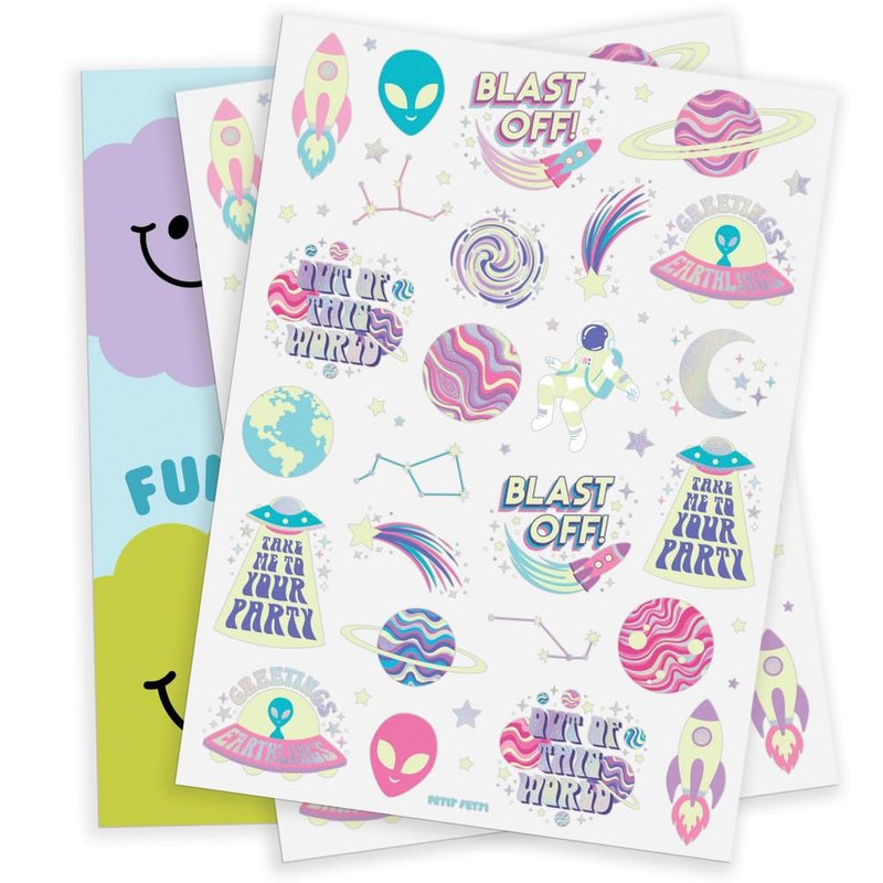 Are you ready to blast off?! Fly your way into a super cool birthday party with this colorful set of glow in the dark temporary tattoos! 2 sheets totaling 50 tats means there's one for everyone - no earthling gets left behind :) Elevate your party with these tattoos that feature all sorts of fun outer space designs: mars, aliens, rocket ships, shooting stars, planets + more! Party tested + approved... our tattoos will last day into night - so put your space suit on and get ready for the journey of your life!