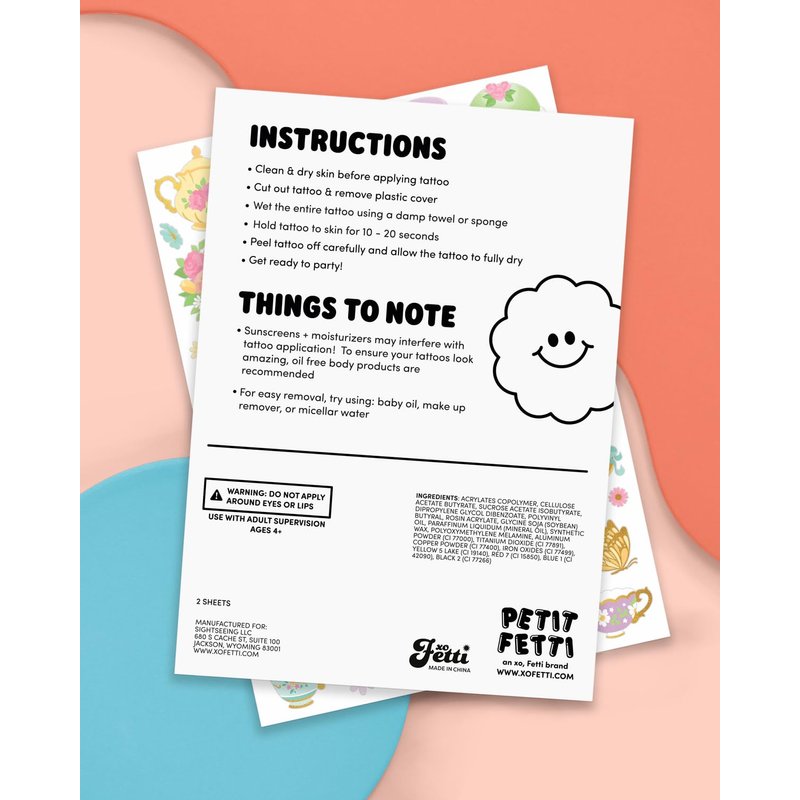 - Tat up: with foil designs like tea cups, butterflies, macaroons, tea kettles, cupcakes + more. Guaranteed to be a favorite by all party guests!